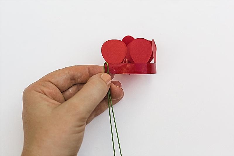 Step One. Take the green wire that is doubled over and twist the strip of self-adhesive petals around it. This part was not as easy as it sounds. You see, the strip doesn’t curve like the petals need to, so you end up having to correct its path around the stem over and over again. At a certain point, you give up trying to make it look perfect.