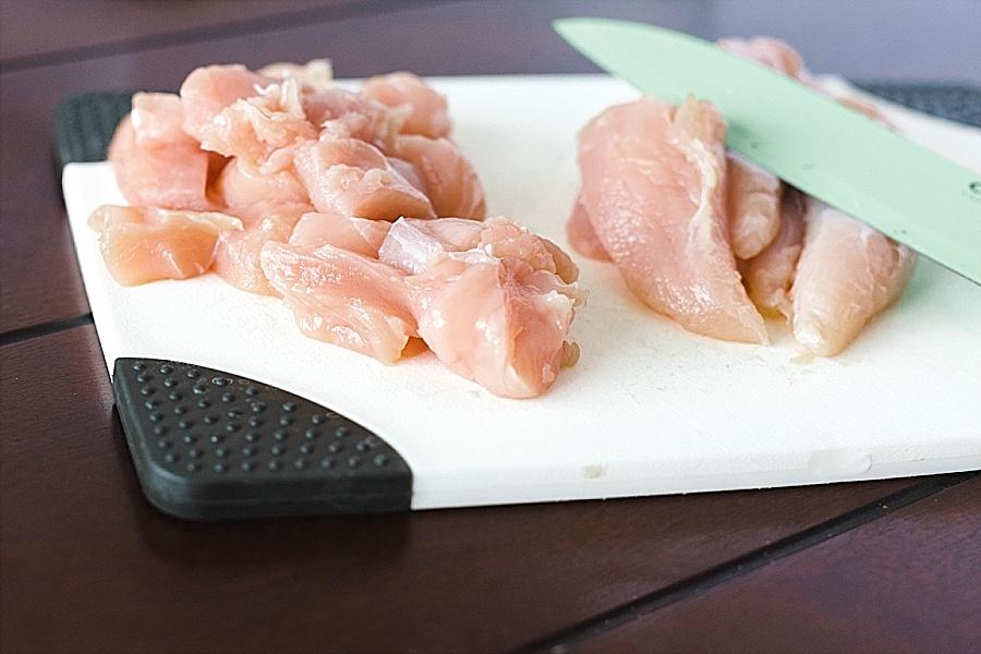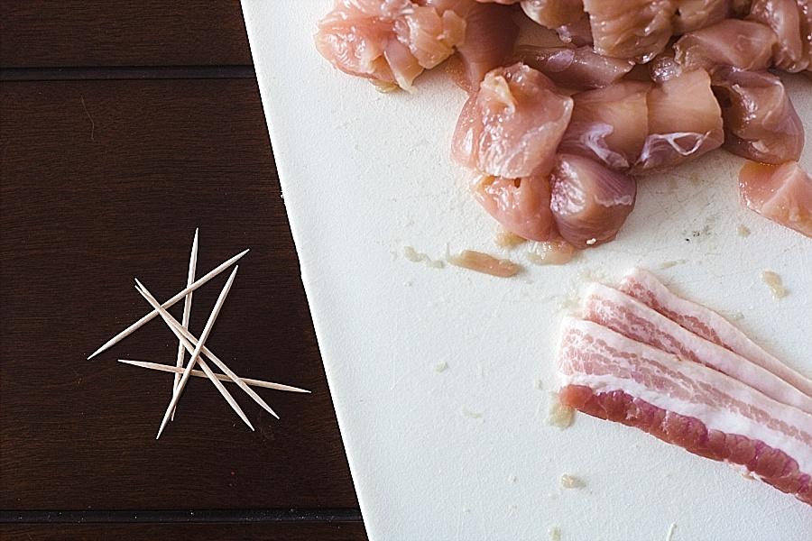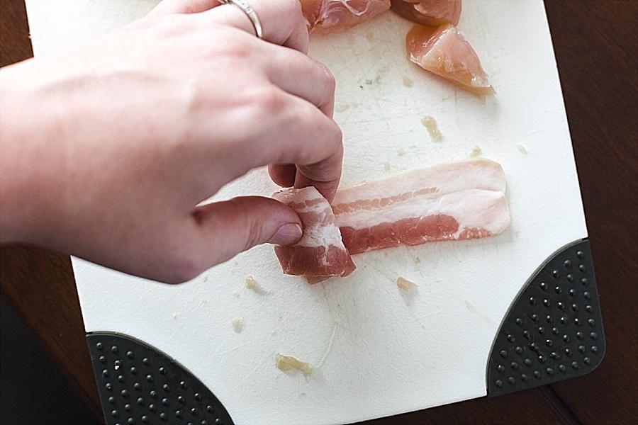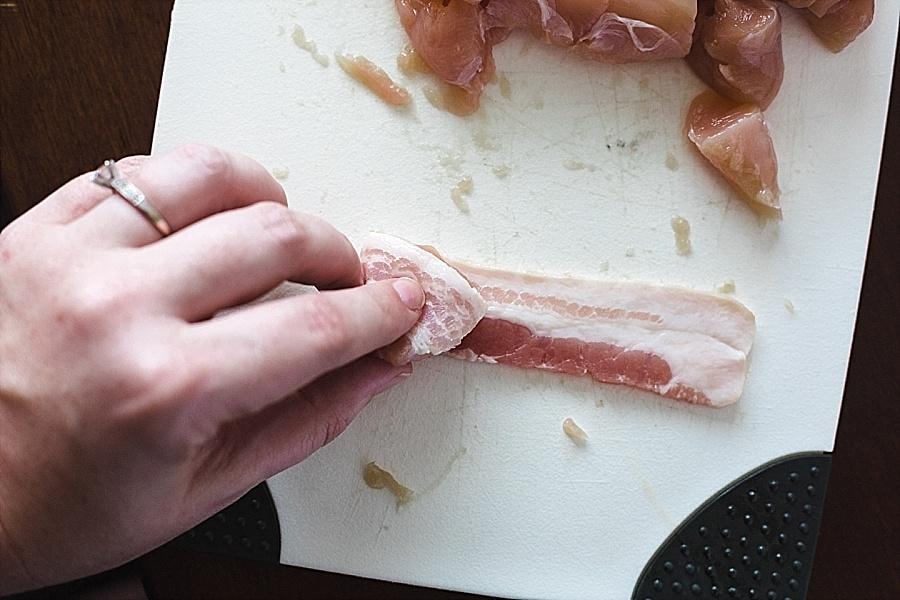 Step Two. Cut the chicken into bite sized pieces. Also, cut the bacon once in half.
