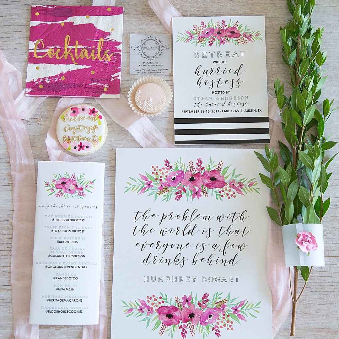 Our first day consisted of a welcome cocktail party at our Air BnB. The amazing sponsors who made this happen were: K and S (printed designs), Toast From the Host (cocktails), Twirl Cotton Candy, Dripping Springs Vodka, Tudorhouse Cookies, Heritage Macarons, B & B Butchers (charcuterie board), Casa de Flores Floral Design, Godiva, and Hem Me In (embroidered cocktail napkins).