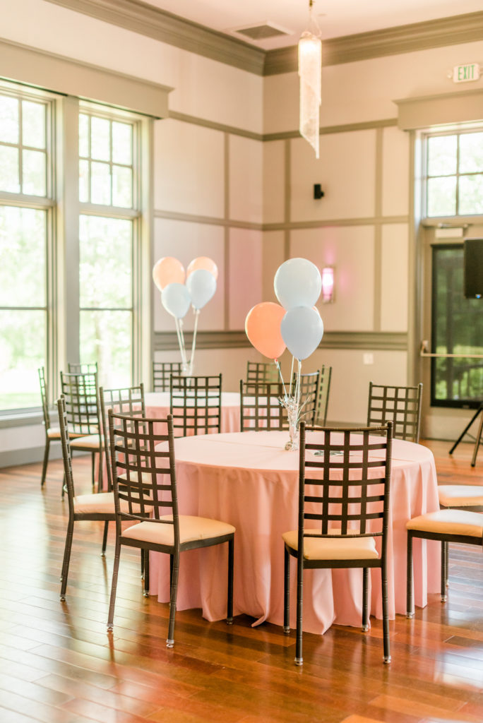 Because I can never have enough balloons (and they make a great statement and take up space), I also used helium-filled balloons tied to weighted silver decorations to be the centerpiece on each table.