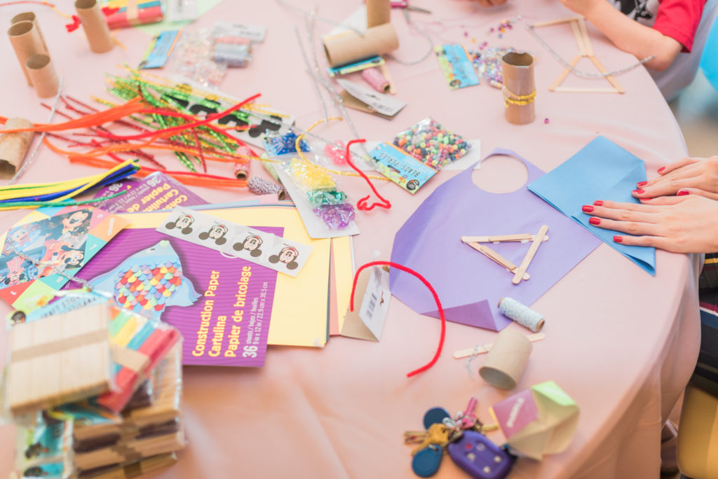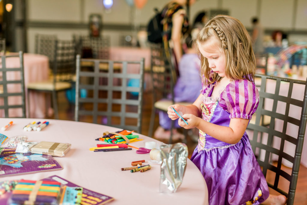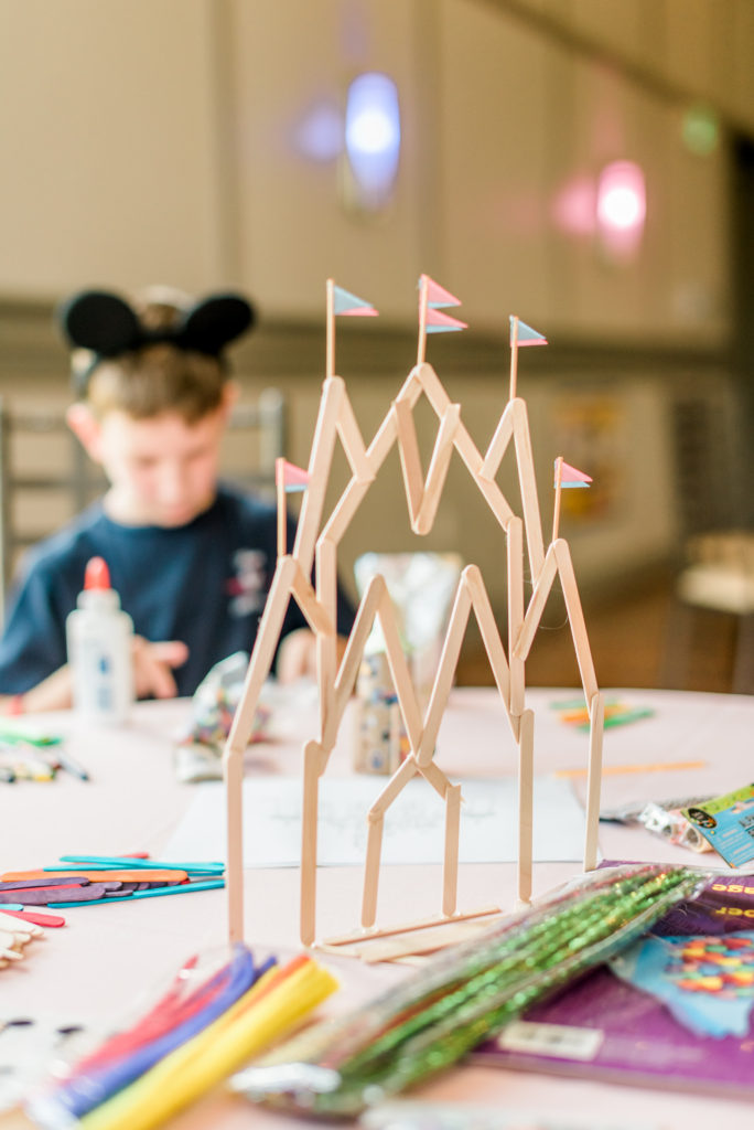 When the kids need to calm down a bit or are more on the creative side, I love setting up craft stations at parties. When I was a kid, this was my jam! I could sit and be creative for hours (and my daughter was the same way at this party…let’s just say she likes glue… A LOT). There was no real plan for this station – just give kids some craft supplies and let them use their imaginations. My son and I created a couple things myself as inspiration on the table, but I wanted to let the kids embrace their inner artists on their own. I had to make it myself, but I did get my “Cinderella Castle” after all! On the table, I had crayons, markers, glue, scissors, construction paper, pipe cleaners, popsicle sticks, plastic beads, letter beads, and twine. It was awesome getting to see all the kids’ creations!