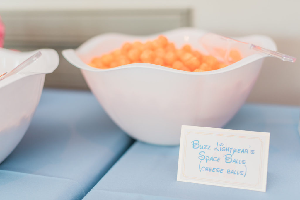 Every party needs something you can graze on, like “Buzz Lightyear’s Space Balls (cheese balls), the “Lost Boys Food Fight” (grapes in red and green), “Olaf’s Snow Flurries” (popcorn), and Mickey’s special edition goldfish. Just make sure to use some of these scoops for easy serving that kids can do themselves.