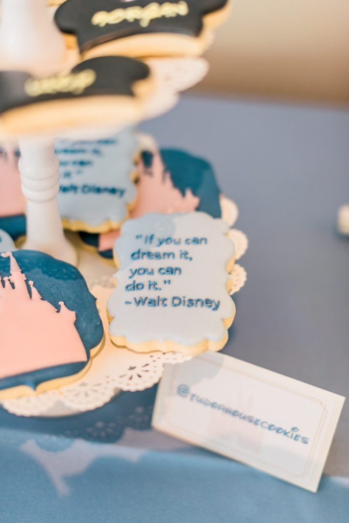 Tudorhouse Cookies also made these AMAZING Magic Kingdom themed cookies and it really sent the theme over the top! She really got the magic of the Magic Kingdom summed up – Mickey ears, Cinderella Castles, and Walt Disney quotes about chasing your dreams.