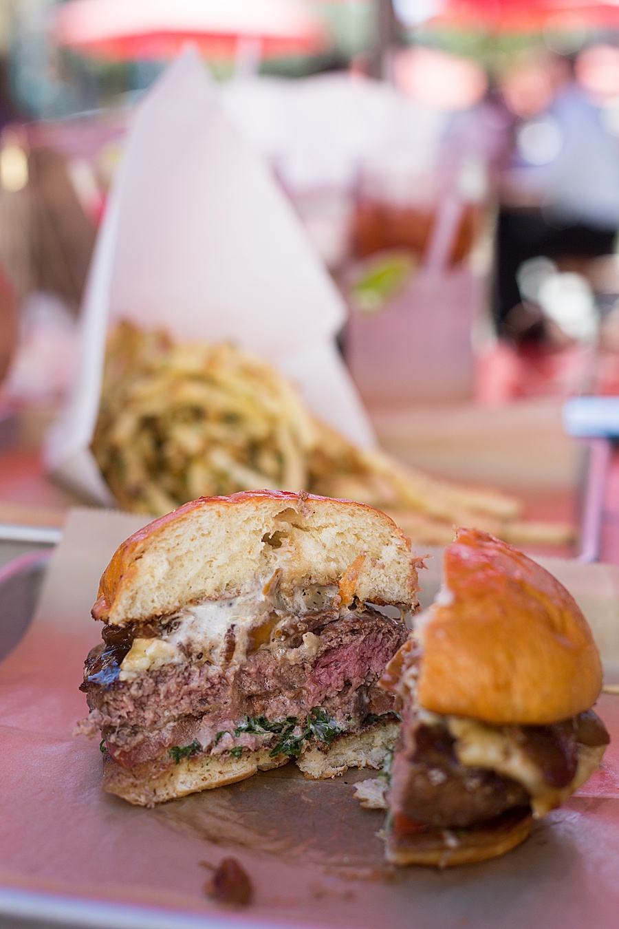 Now for the main event – the BURGERS! First up is my choice – the Primetime Burger. This delicious kobe beef burger seriously made my taste buds jump for joy! It’s topped with brie cheese, arugula, caramelized onions, truffle aioli, steak sauce and a tomato slice. This thing was so dang good! I had to pause for a moment after I took the first bite – I wasn’t ready for it. I’ve had a lot of burgers in my lie, but this one is definitely up there near the top as one of the best, if not the best.