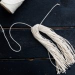 Bend your cut pieces in half and take the end of the garland with buttons on it and tie a knot around the bend (middle) of your stack of cut the pieces of twine.