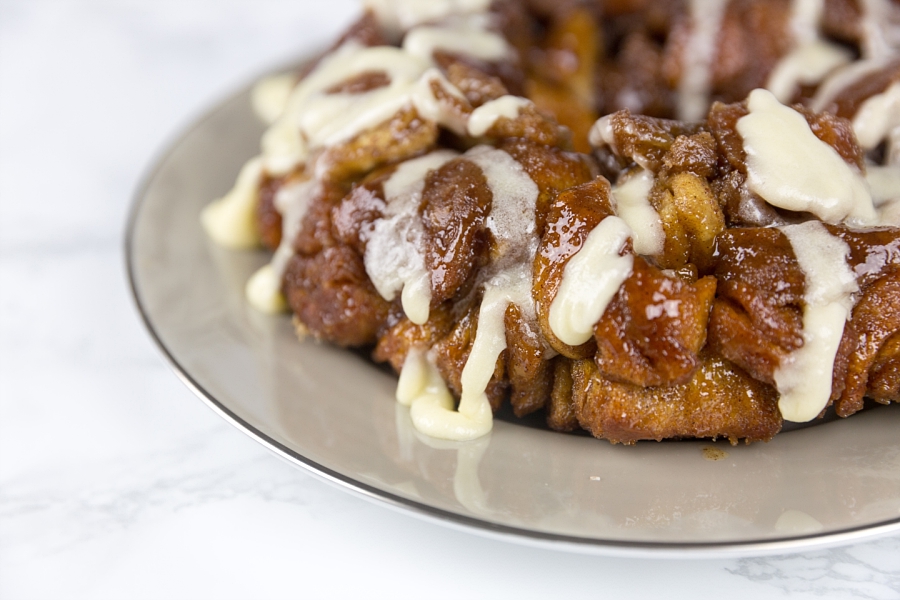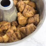 - Bake for about 25 minutes. This is not something you want to overcook – we’re trying to avoid the crunchy parts, right? Let it cool for about 5 minutes and then flip the bundt pan over on a plate. You can then use the icing to top the monkey bread or just leave it as is – both ways are tasty.