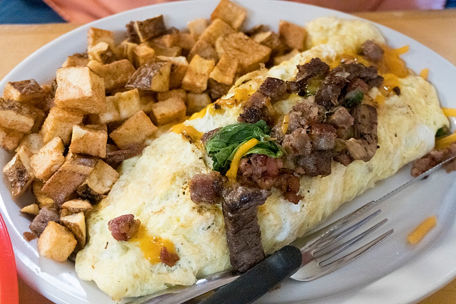 My husband loves hole in the wall type breakfast places and this is definitely one. You know the ones – there’s no frills, you eat off styrofoam plates, and the waitresses call you “sweetie”. We opted for the BLT, omelette, sausage biscuit, and pancakes. Everything was good, but they definitely aren’t in hurry.