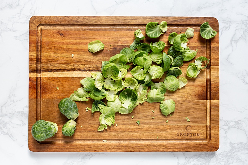 - Remove all outer leaves from the brussels sprouts (reserve cores for roasting or pickling).