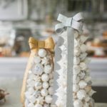 - Next, you’ll be adding the ribbon on top. Royal icing is pretty strong stuff, so after you’ve tied a box into your ribbon, just put a generous amount on the back of the knot on the bow and attach it to the top of the meringue tree.