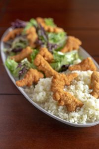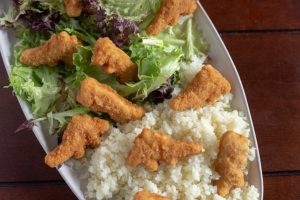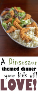For our latest dinner including the dinosaur Tyson Fun Nuggets , I opted to serve the dinosaur shaped chicken in a “forest” of lettuce with light dressing and a “dessert” of cauliflower rice. Of course, the kids don’t ever want their different food items to touch, so they get a little dressing on their salads and a dollop of ketchup on the side of the Tyson Fun Nuggets so they can make their dinosaurs “bloody” (my kids are silly like that). They loved it! Even a quick dinner at home can be fun and interactive for them!