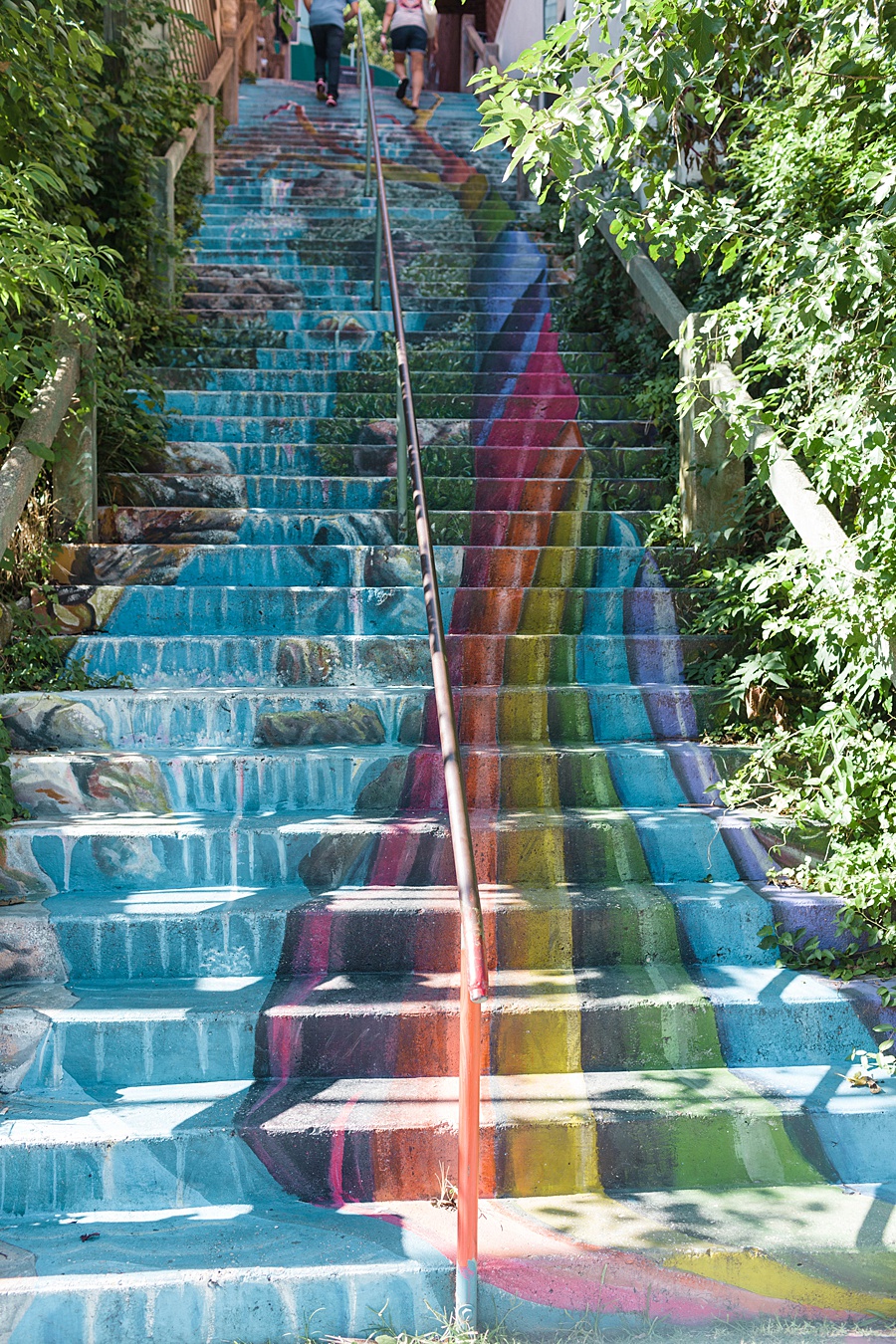 When exploring downtown, we saw this camera painted on the ground. Following the arrow, we looked across the street and it was the most brightly-colored set of rainbow stairs you’ve ever seen!