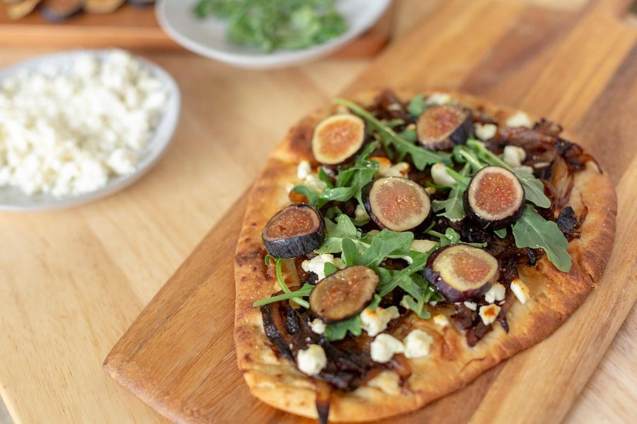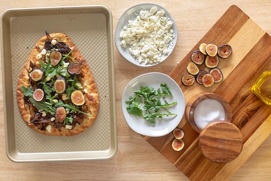 Step Five. Remove the flatbreads from the oven and allow them to cool slightly (just a couple minutes). Next, add some arugula and sliced figs on top of each flatbread and drizzle with olive oil. Add a little salt and pepper to the top, slice, and enjoy!