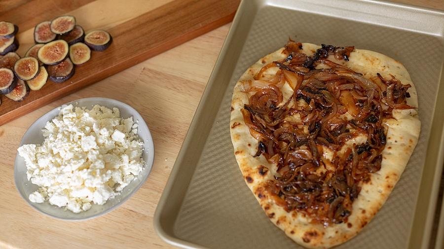 Step Four. Place the flatbread on baking sheet and top them with a generous amount of the caramelized onions. Put a tablespoon of feta cheese on each flat bread and bake in the oven for 8 minutes.