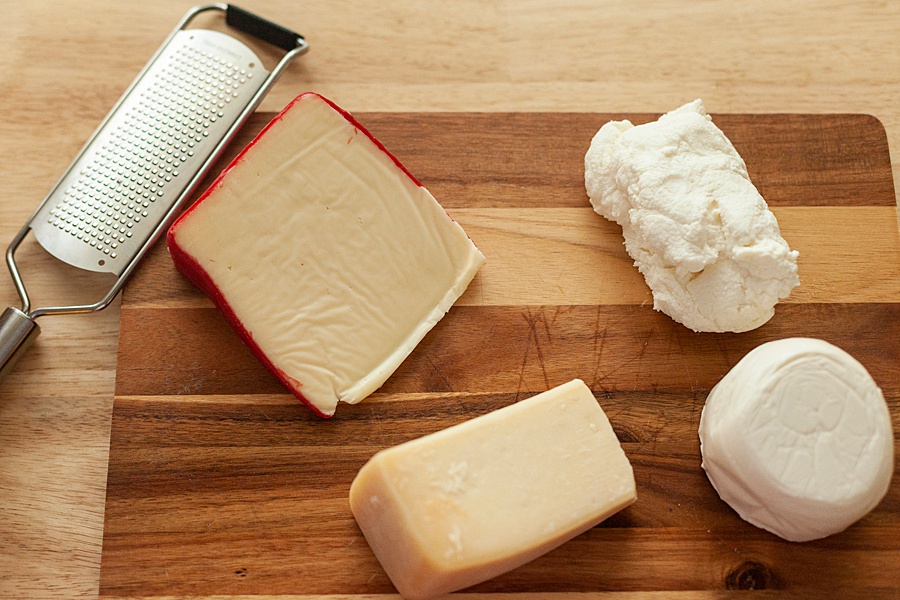 - In a large bowl, combine the cheeses and season with salt and pepper. Add the egg and stir until well combined.