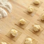 Create your thin sheets of fresh pasta and lay flat on a cutting board. Cut out 2 inch squares with a cookie or biscuit cutter to ensure the ravioli are uniform sizes.