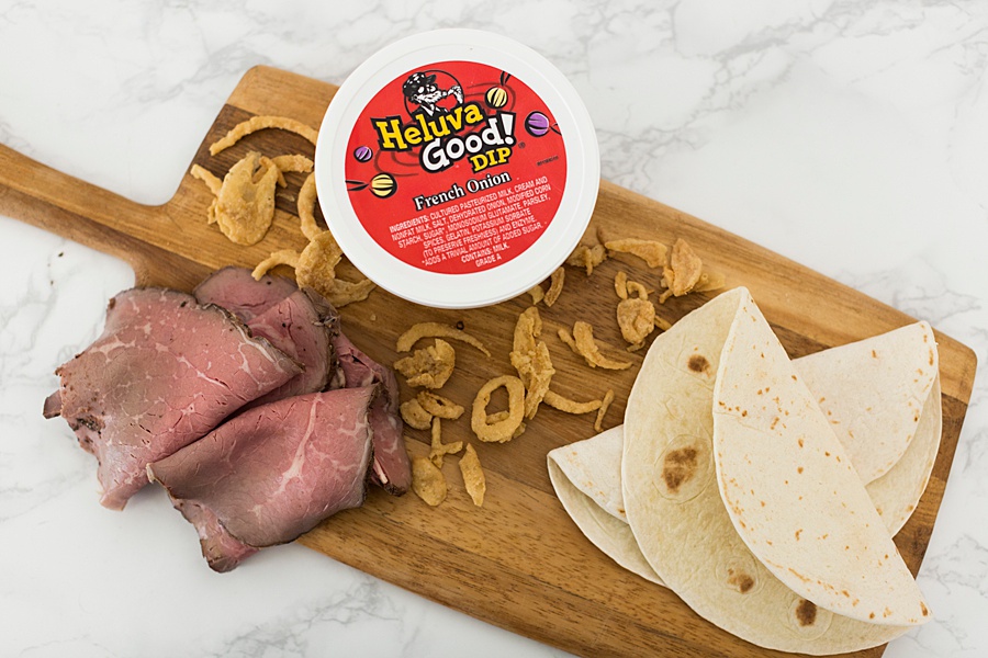 This easy appetizer has all of the best things in it – tortillas, Heluva Good!'s French Onion Dip, roast beef, cheese, and French fried onions.