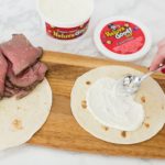 Lay the 2 tortillas on a counter or work surface. Spread Heluva Good!'s French Onion Dip evenly across the surface of the tortilla.
