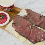 - Place the deli roast beef evenly over the cheese.
