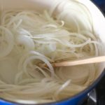 - In a large pot, melt the butter over medium high heat. Add the onions (I used a mandolin to get them nice and thin) to the pot and cook for about an hour – stirring every few minutes.