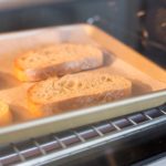- While the soup is simmering, slice the baguette into 1/2 inch slices and toast in a 400 degree oven for about 6 minutes, or until the edges are golden brown.