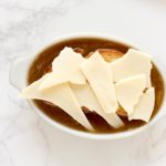 - Turn the broiler portion of your oven on. On a baking sheet, place your oven safe serving bowls. Fill each bowl with soup. Top the soup with a bread slice and then your cheese of choice on top. I used 1 slice of Mozzarella, but if you use grated cheese, it will be about 1/4 cup.