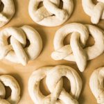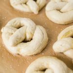 Roll out each piece of dough into a 24-inch rope. Make a U-shape with the rope, holding the ends of the rope, cross them over each other and press onto the bottom of the U in order to form the shape of a pretzel. Place onto the parchment-lined half sheet pan.