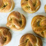 Place the pretzels into the boiling water, 1 by 1, for 30 seconds. Remove them from the water using a large flat spatula. Return to the half sheet pan, brush the top of each pretzel with the beaten egg yolk and water mixture and sprinkle with the pretzel salt.