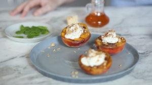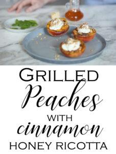 Sweet peaches are grilled to perfection and topped with tangy ricotta and a drizzle of sweet honey to make this delicious dessert.