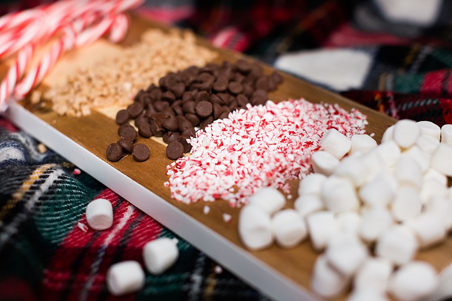 The amount of toppings are endless when it comes to what you can put on your hot coca. Some of my favorite toppings include: marshmallows, toffee bits, coarse sea salt, mini chocolate chips, crushed peppermints, candy canes, soft peppermint sticks, whoppers, Lindt truffles, pirouette cookies, whipped cream, dark chocolate syrup, and caramel sauce.