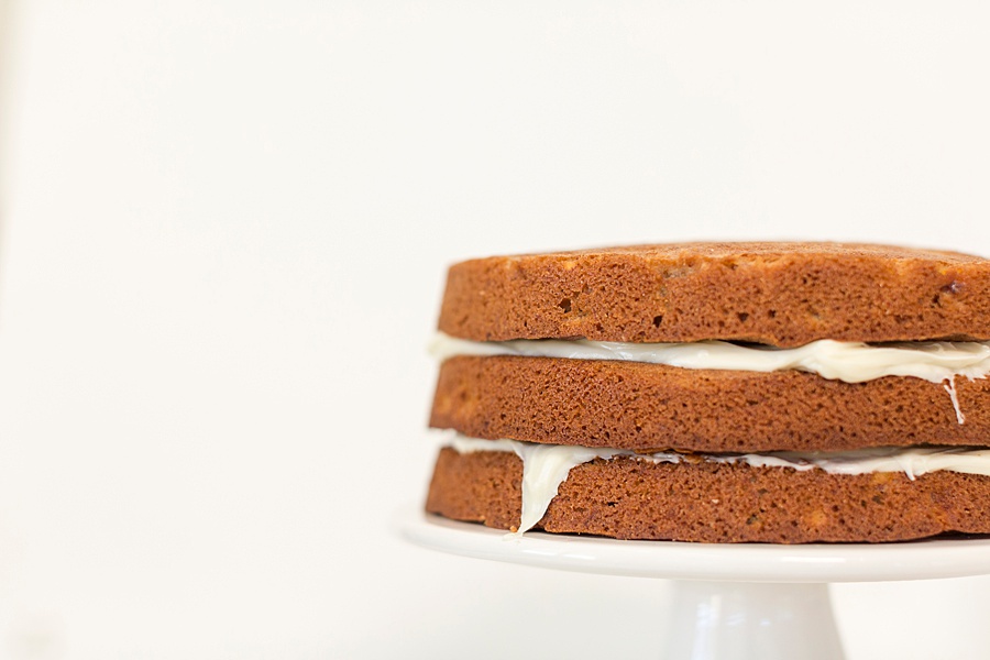 - Place 1 cake layer on a serving platter. Spread 1 cup Cream Cheese Frosting over cake layer. Top with second layer, and spread 1 cup frosting over cake layer. Top with third cake layer, and spread top and sides of cake with remaining frosting. Arrange pecans on the outside of the cake however you like.