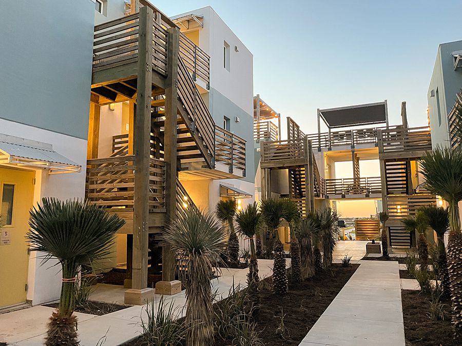 The look is a beautiful Riad-style design that’s surrounded by preserved wetlands. It’s situated right across the dunes from the gulf. So for the best views, climb to the roof top deck at Surfrider or Mavericks for 360-degree views of the gulf and the bay.