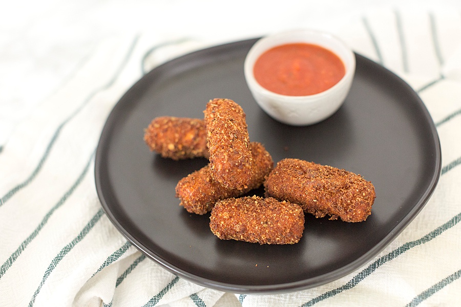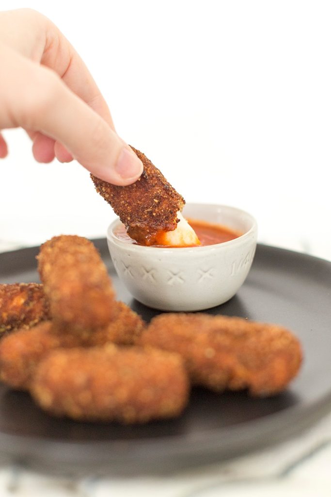 This past week, the kiddos got mozzarella string cheese sticks every single day. Times two, that’s a heck of a lot of cheese sticks. So what do I do with them? I could cut them up and put them in a lasagna, top a homemade pizza, or put it in a salad. But why not fry it?
