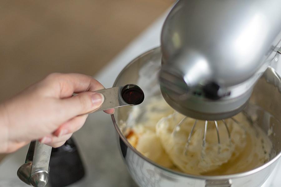 Step Three. Add the mascarpone cheese, vanilla, and 3 tablespoons sugar to the stand mixer and combine until it’s smooth and lump free.