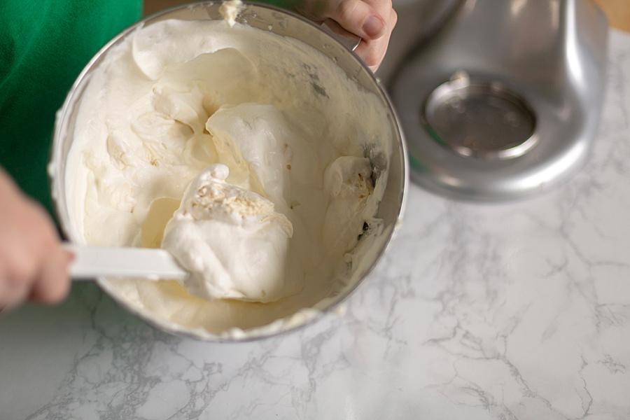 Step Four. Gently fold the whipped cream into the mascarpone cheese mixture. Then place it back in the stand mixer and whisk it until it’s lump free.
