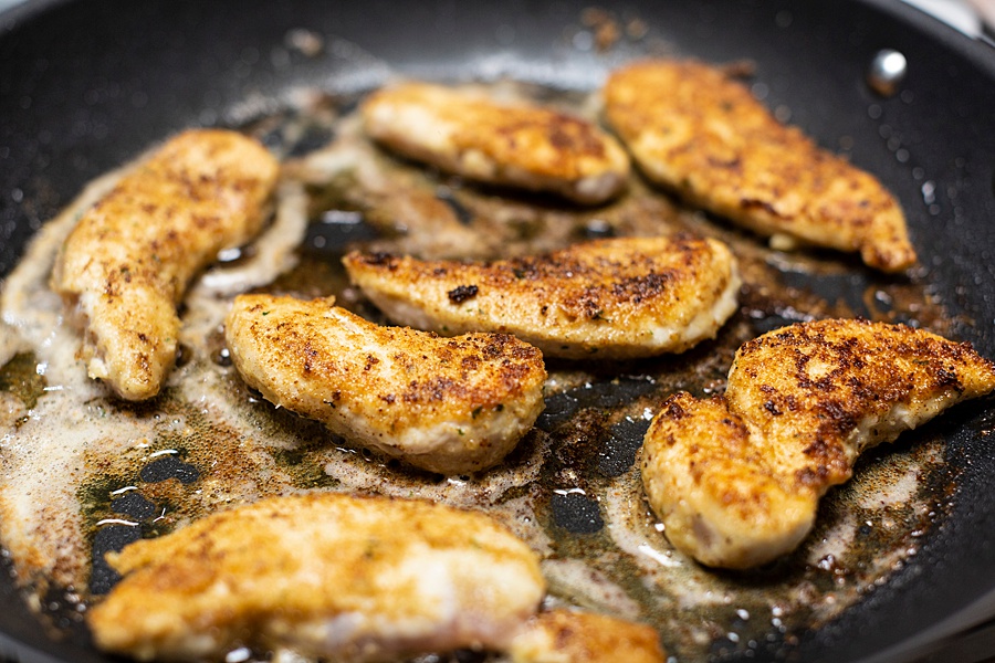 3. Cook on each side for about 3-4 minutes until the outside is crispy and the chicken is cooked throughout. Set aside on plate.