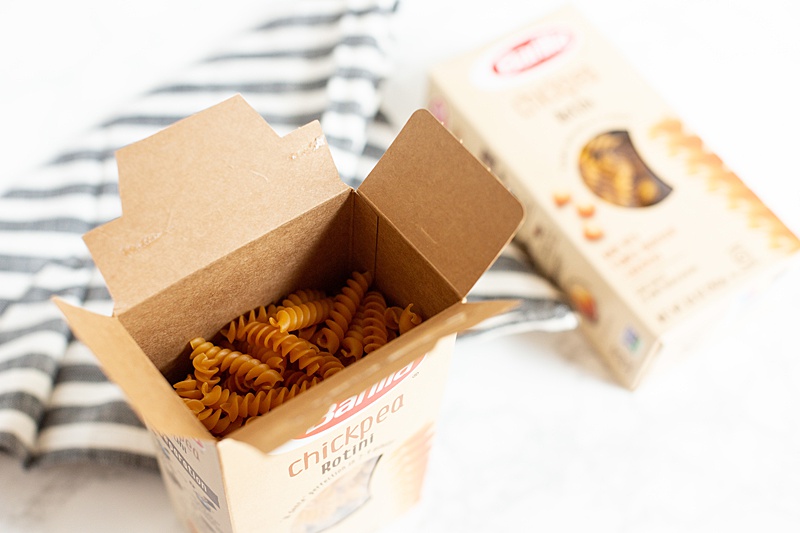 In sticking with the Mediterranean Diet, you can’t just use regular old pasta with enriched flour, oh no! To really eat like the Grecians, you need pasta that can keep things light and fresh. For this recipe, I used Barilla Chickpea Rotini that I bought at Target.