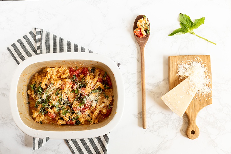 3. Carefully remove the baker from the microwave and remove the lid, lifting it away from you. Add the basil and cheese to bowl; mix well. Garnish with reserved 2 tbsp basil and additional Parmesan cheese if desired.