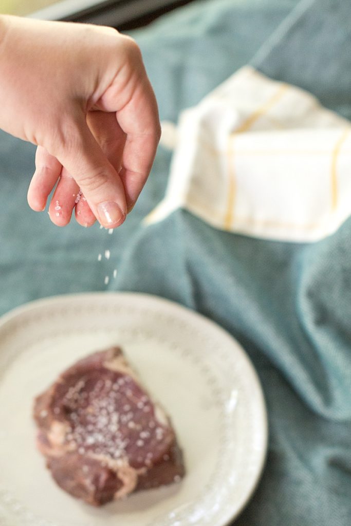 Once they have reached room temperature, put them dry with a paper towel and generously cover the top of the steak with the coarse salt and a few shakes of pepper. This will create a great crust on top of the steak. Allow the steaks to sit for 30 minutes.