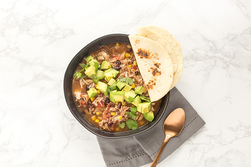 This chicken taco soup is flavorful, delicious, and perfectly cooked in a slow cooker for minimal effort.