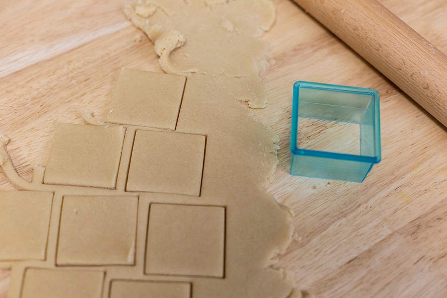 - Roll out your dough until it’s 1/2 inch thick or less. Using a cookie cutter, cut out whatever shapes you like in the dough and place the cookies on a cookie sheet about an inch apart.