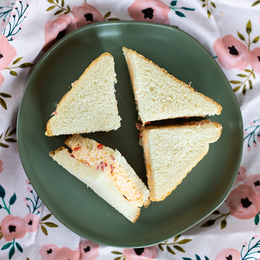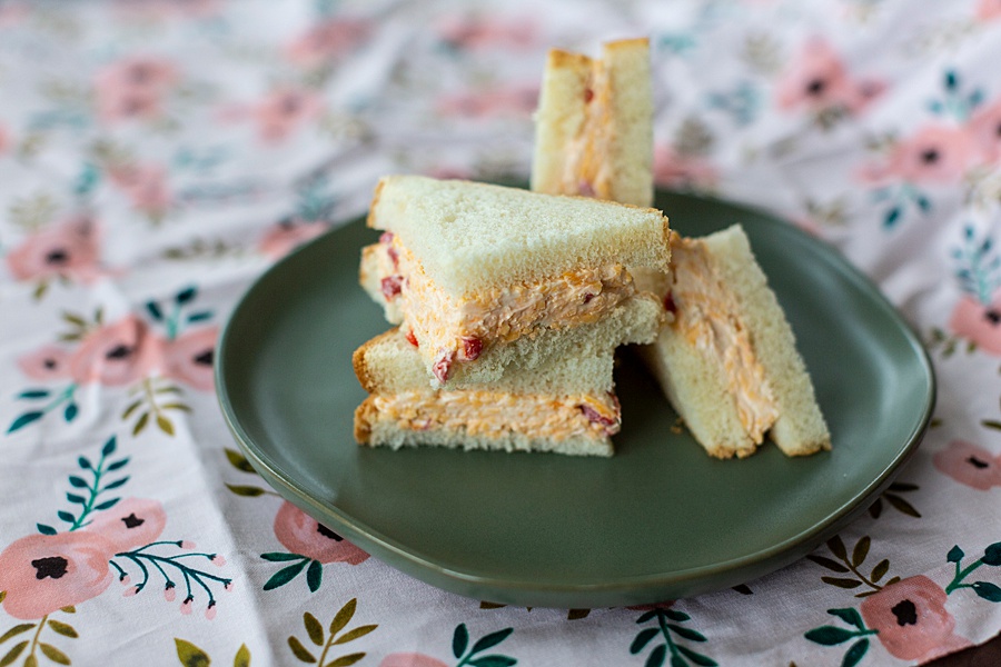 Pimento cheese sandwiches was always something the girls in our house liked – i.e., my mom and I. My dad and brother would turn their noses up at it because it didn’t have meat in it, but my mom and I could make ourselves sick eating the leftovers of this delicious spread. And that’s usually when we got to eat it too – after we had hosted a baby shower or something like that. My mom has always been someone who liked to make easy (but delicious) snacks and appetizers for parties, and pimento cheese finger sandwiches were always a crowd favorite. Here’s her recipe for the best dang pimento cheese ever!