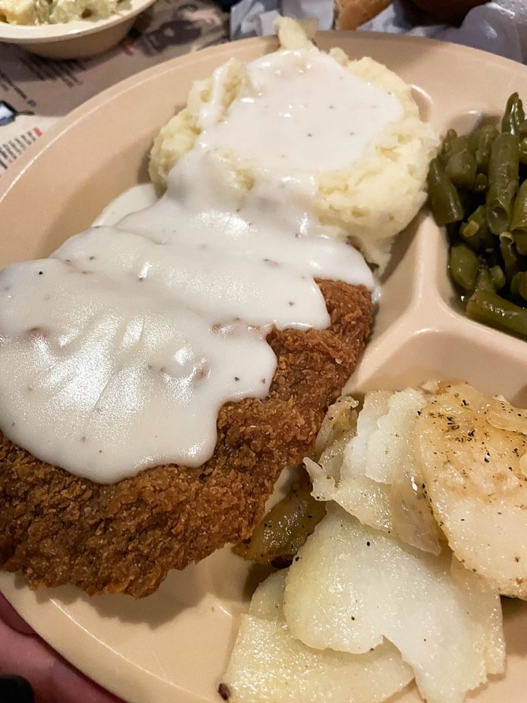 This huge restaurant is serving up Southern classics as well, but at a much more affordable price tag than Paula Deen’s. The menu is pretty extensive and has a lot of great southern options. Our table of 6 ordered chicken fried steak, hamburger steak, and chicken and dumplins’ and everything we got was hot, fresh, and delicious. I also love a restaurant that has things they bring out to you that are included in the meal price. Going around the restaurant were black eyed peas, fried okra, fried potatoes, and they’ll even throw you a roll or two (which the kids loved).
